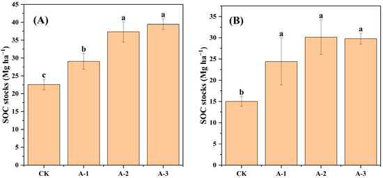 Soil organic carbon (SOC) stocks in the topsoil (A) and subsoil (B). CK, intensive management; AM-1, 2–5 years abandonment; AM-2, 7–10 years abandonment; AM-3, 11–14 years abandonment. Different lowercase letters indicate significant differences between different groups (p < 0.05). log10SOC stock (Mg ha−1).