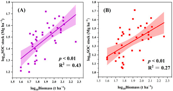 Relationship between soil organic carbon (SOC) stocks and biomass in the topsoil (A) and subsoil (B). The shaded area represents the 95% confidence interval and the solid line represents the fitted regression.
