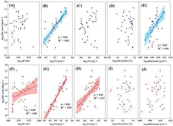 Relationship between soil organic carbon (SOC) stocks and (A) pH, (B) TN, (C) TP, (D) soil moisture, and (E) bulk density in the topsoil. Relationship between SOC stocks and (F) pH, (G) TN, (H) TP, (I) soil moisture, and (J) bulk density in the subsoil. TN: total nitrogen; TP: total phosphorus. The shaded area represents the 95% confidence interval, and the solid line represents the fitted regression.