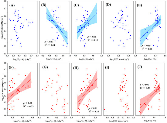 Relationship between soil organic carbon (SOC) stocks and (A) Fed + Ald, (B) Fep + Alp, (C) Feo + Alo, (D) CEC, and (E) clay content in the topsoil. Relationship between SOC stocks and (F) Fed + Ald, (G) Fep + Alp, (H) Feo + Alo, (I) CEC, and (J) clay content in the subsoil. Fed + Ald: sum of free Fe and Al oxides; Fep + Alp: sum of complexed Fe and Al oxides; Feo + Alo: sum of poorly crystalline Fe and Al oxides; CEC: cation exchange capacity. The shaded area represents the 95% confidence interval, and the solid line represents the fitted regression.