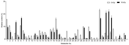 - Kim, J.H.; Lee, M.H.; Moon, Y.R.; Kim, J.S.; Wi, S.G.; Kim, T.H.; Chung, B.Y. Characterization of metabolic disturbances closely linked to the delayed senescence of Arabidopsis leaves after γ irradiation. Environ. Exp. Bot. 2009, 67, 363–371. [Google Scholar] [CrossRef]