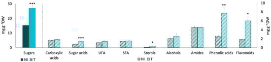 Phytochemical profile of non-inoculated and inoculated Salicornia europaea under field conditions, according to chemical families of compounds detected with GC–MS and UHPLC–MS. NI—non-inoculated plants; EB3 + RL18—plants inoculated with Brevibacterium casei EB3 and Pseudomonas oryzihabitans RL18. The columns represent the average of 3 biological replicates, and the error bars correspond to the standard error. The data obtained were compared by t-test (carboxylic acids, sugar acids, and amides) and the Mann–Whitney U test (saturated and unsaturated fatty acids, sterols, alcohols, and sugars); significant differences are indicated by * (p < 0.05), ** (p = 0.004) and *** (p = 0.002) between the control and the test.