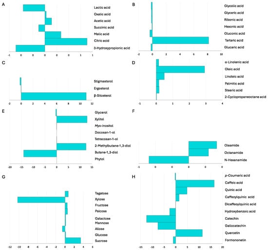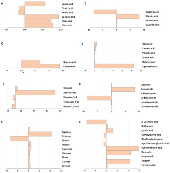 Response of Salicornia europaea secondary metabolism to inoculation with PGPB Brevibacterium casei EB3 and Pseudomonas oryzihabitans RL18 under field conditions. Fold changes are expressed as Log2 ((EB3 + RL18)/NI). (A)—Carboxylic acids; (B)—Sugar acids; (C)—Sterols; (D)—Fatty acids; (E)—Alcohols; (F)—Amides; (G)—Sugars; (H)—Phenolic compounds.