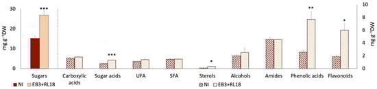 Phytochemical profile of non-inoculated and inoculated Salicornia europaea in controlled conditions (microcosm experiments), according to chemical families of compounds detected with GC–MS and UHPLC–MS. NI—non-inoculated plants; EB3 + RL18—plants inoculated with Brevibacterium casei EB3 and Pseudomonas oryzihabitans RL18. The columns represent the average of 3 biological replicates, and the error bars correspond to the standard error. The data obtained were compared by t-test (sugar acids, saturated fatty acids, alcohols, amides, and phenolic acids) or the Mann–Whitney test (unsaturated fatty acids, sterols, sugars, and flavonoids); significant differences are indicated by * (p < 0.05), ** (p = 0.004) and *** (p = 0.002) between the non-inoculated control and the test.