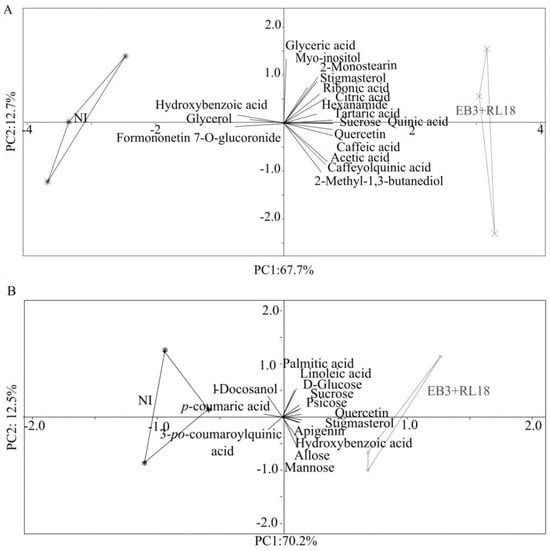 The fold changes in the concentration of metabolites for which significant differences between the inoculated and non-inoculated plants, expressed as Log2 ((EB3 + RL18)/NI), were detected are summarized in Figure 2. The heterogeneous response profiles to inoculation are visible within each group of metabolites, where positive and negative responses can be observed. The profile response of the sugar acids and flavonoids (especially catechin, gallocatechin, and formononetin) was negative, characterized by a decrease in these metabolites with inoculation, whereas the profile response of the carboxylic acids (malic, citric, and acetic acids), fatty acids (especially unsaturated fatty acids), sucrose, ß-sitosterol, phenolic acids, and quercetin was positive, representing an increase in these metabolites in the inoculated plants.