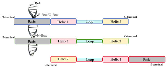 The structural representation of bHLH TFs. There are three bHLH TFS in the diagram: one binds to the E-Box/G-Box in the DNA sequence; one binds to the N-Box in the DNA sequence; and one does not bind to DNA sequence.
