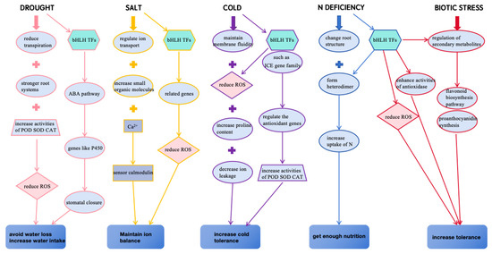 Plant responses to various environmental stresses are controlled by a cascade of molecular networks. Various stress-related molecules activate stress response mechanisms to re-establish cellular homeostasis and protect and repair damaged proteins and biofilms—the bHLH TF family plays a critical role in this process.