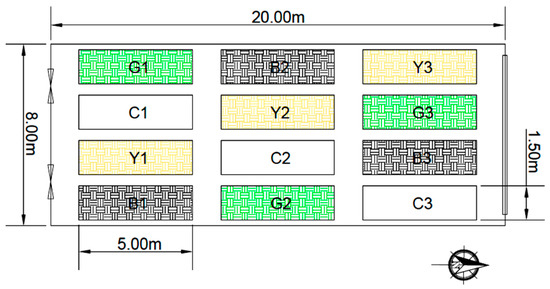 The distribution of the colored shading nets blocks, blocks with black shading nets (B), blocks with green shading nets (G), blocks with beige shading nets (Y), and the control blocks (C). Each shading net covered three blocks (replication) with dimensions of 5 m × 1.5 m × 3.5 m.