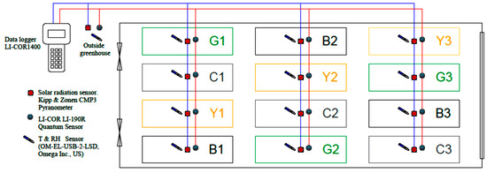 - The global solar radiation flux (SR) and the photosynthetically active radiation (PAR) were measured using the Kipp & Zonen CMP3 Pyranometer and LI-COR LI-190R Quantum Sensors, respectively. The SRg and PAR were measured under each of the shading blocks, unshaded blocks, and outside. The sensors were programmed to scan the experimental measurements every minute, and the average was recorded every five minutes. Data were collected using a LI-COR 1400 data logger (Figure 3).