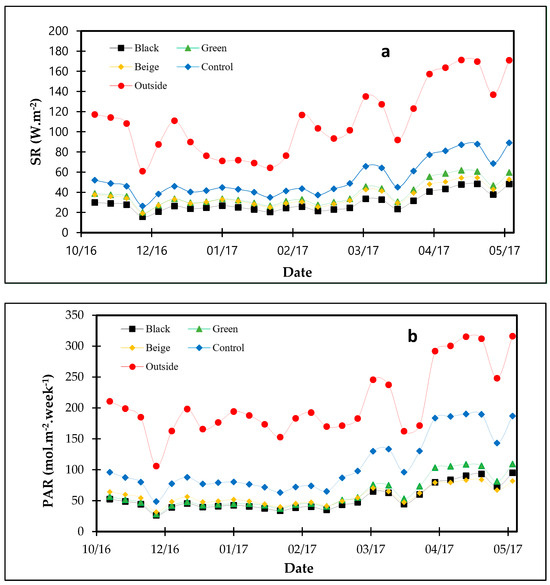 The weekly total of (a) solar radiation (SR, kJ·m−2) and (b) photosynthetically active radiation (PAR, mol·m−2·week−1) under the influence of colored shade nets (green, black, and beige) and the control treatment.