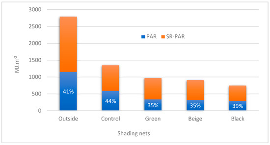 In Figure 5, the ratio of photosynthetically active radiation (PAR) to solar radiation (SR) (PAR/SR) is shown for each treatment and the outside condition. Outside the greenhouse, the PAR/SR ratio was approximately 41%. In the control group, which was affected only by the polycarbonate cover, the PAR/SR ratio increased to 44%. Among the treatments with net coverings, the black net had the highest ratio (39%). The black net allowed the least amount of PAR and SR to pass through, with total SR and PAR values of 746.8 and 293.7 (MJ·m−2), respectively. In comparison, the green net had SR and PAR values of 969.6 and 337.2 (MJ·m−2), respectively, while the beige net had SR and PAR values of 906.7 and 320.8 (MJ·m−2), respectively. According to Shahak et al. [7], the black shading net reduces light transmission to the plants while maintaining its quality. Additionally, Al-Helal and Abdel-Ghany [24] observed that shading nets with shinier colors had higher levels of light transmission, reflecting almost all incident PAR, compared to dark screens that only reflect incident PAR in the specific color band and absorb incident PAR from the remaining complementary colors of the spectrum. Kittas et al. [27] reported that black nets neutralize the PAR/SR ratio and reduce PAR inside the greenhouse. The green and beige nets had the lowest PAR/SR ratio (35%) since these colors promote greater reflection in the wavelengths of the visible light spectrum (PAR). According to Al-Helal and Abdel-Ghany [24], the green and beige nets transmit less PAR than the black net but promote greater PAR reflection.