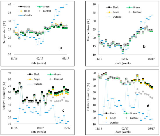 The weekly averages of (a) air temperature at daytime (°C), (b) air temperature at night time (°C), (c) air relative humidity at daytime (%), and (d) air relative humidity at night time (%) during the period from November 2022 to May 2023.