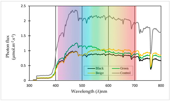 The distribution of photon flux under the influence of colored shade nets throughout the experimental period can be seen in Figure 7. The green and beige nets have demonstrated the ability to modify the spectrum or quality of light within the greenhouse.