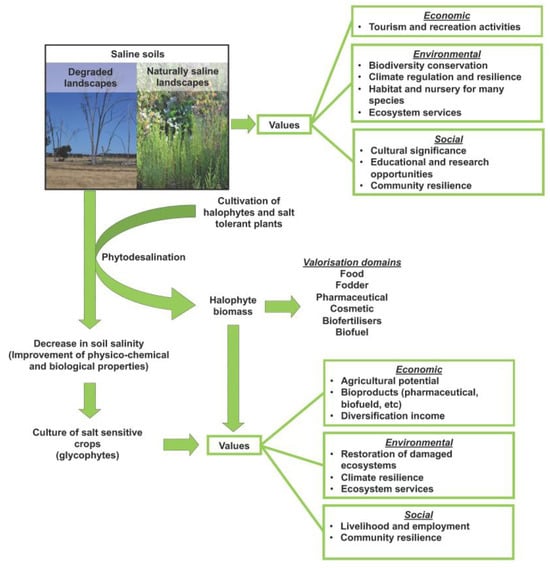 Notwithstanding the negative impact of salinity, salt-affected land provides several important ecosystem services, which are services provided by nature to humans with an economic, environmental, or social impact at different spatial and temporal scales. Indeed, salt-affected land and saline landscapes provide significant values across different aspects, ranging from climate regulation and providing habitats and nurseries for a myriad of species to food production. Furthermore, the sustainable use of saline environments prevents land use changes in other non-degraded ecosystems [7,8]. Indeed, the restoration of salt-affected lands is crucial to making salt-affected ecosystems suitable for use for agricultural purposes. Recently, an FAO publication [9] showed that 1.5 billion people affected by their inability to produce food are living in these marginal environments. Salinization renders around 1.5 million ha of farmland unproductive each year [10] and this is projected to worsen due to ongoing climate change forecasts. In anticipated future circumstances, where salinity is projected to surpass 200 mM NaCl, staple crops are expected to become unproductive [11]. In the future, salt-tolerant halophytes will, therefore, play a vital role in ensuring food security in arid and semi-arid regions. Indeed, halophytes are not only valuable scientific models to improve the performance of traditional crops in salt-affected soils but are also commercially viable alternative crops in saline agriculture, with many species used as food, fodder, or bioenergy crops (see sections below and Figure 1). Furthermore, various alternative agronomic practices worldwide, such as intercropping or rotation, demonstrate the potential of using these plants for restoring saline soils through phytoremediation, specifically halo-phytoremediation [12]. These practices are yielding promising results in terms of both yield and quality for cash crop species. For example, Arthrocaulon macrostachyum holds significance for desalination and co-cultivation. When grown in saline soil, it effectively reduces soil salinity by 30% within 30 days [13]. In addition, when co-cultivated with barley, wheat, and tomato, this halophyte reduces the negative effects of salt on the growth of sensitive crops [14]. This could be of great importance in arid and semiarid regions, where insufficient precipitations and drip irrigation systems are unable to reduce the salt content in the rhizosphere. Compared with other techniques, phytoremediation has several unique advantages, including removing salt uniformly, absorbing other pollutants simultaneously, and improving soil quality [15]. Cultivating halophytes not only efficiently restores saline soils but also directly supplies food, fodder, and industrial materials. For example, Salicornia bigelovii, a potential oil-seed halophyte for coastal and saline lands, could produce ca. 18 tons ha−1 of biomass and 2 tons ha−1 of seeds [16]. Introducing sustainable halophyte farming in arid and semi-arid regions will bring new, health-promoting food sources and tackle environmental concerns tied to restoring the biodiversity impacted by human activities and climate change.