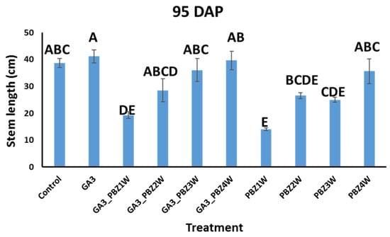Effects of GA3 and PBZ application on Sifra cultivar stem length at 95 DAP. Different letters indicate statistically significant differences (ANOVA, Tukey–Kramer’s HSD, p value ≤ 0.05). Data are from Experiment 1. Weeks 1 to 4 are denoted as 1W to 4W.