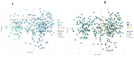 The carotenoid concentration (TCC iCheck) was quantified using iCheckTM Carotene (BioAnalyt, Berlin, Germany), a portable photometer, while the yellowness of the root parenchyma (TCC Chart) was evaluated visually using a 1 to 8 scale. The oven drying method was used to determine the percentage of dry matter content in the roots. CMD severity was assessed on a 1 to 5 scale. The Shapiro–Wilk test showed a substantial departure from a normal distribution (p < 0.05) for the TCC Chart, TCC iCheck, and CMDs, while DMC showed a normal distribution (p > 0.05) (Figure S1). All traits showed moderate or large variations among clones (Table S1). The least dispersed trait was DMC (CV = 0.2), and the most dispersed traits were TCC iCheck (CV = 0.49), followed by CMD (CV = 0.45). Correlation between traits revealed a highly positive significant correlation (r = 0.75, p < 0.05) between the TCC Chart and TCC iCheck. A moderate and significant negative correlation was observed between the TCC Chart and DMC (r = −0.43, p < 0.05). The correlation between all quantitative traits and CMDs was weak (r < 0.29, p < 0.05). The DMC and CMDs did not correlate (p > 0.05) (Figure 1a). Most genotypes (90.85%) with parental seeds from the International Centre for Tropical Agriculture (CIAT) (142) showed a high dry matter content, while genotypes with parental seeds from the International Institute of Tropical Agriculture (IITA) (120) displayed a wider range (Figure 1b). Genotypes obtained from parental seeds from the IITA biofortified cassava breeding pipeline exhibited TCC ranging from low to very high, while genotypes originating from seed sourced from the University of Hawaii (these are either first-generation crosses between CIAT and IITA source material or open-pollination seeds involving only those two source materials) and the CIAT cassava breeding program had TCC that were primarily low (Figure 1c). Regardless of the source of the seed, resistance and susceptible genotypes were present across all programs (Figure 1d).