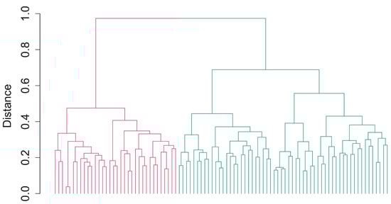 Cluster analysis showing the relationship among the 92 cassava genotypes. The 92 genotypes are separated into two clusters, with 34 and 58 accessions in clusters 1 (red) and cluster 2 (green), respectively.