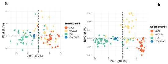The 345 genotypes were separated into two main clusters, as shown by the dendrogram generated by hierarchical clustering, with some distinct substructures discernible within the two groups (Figure S6). PCA analysis failed to clearly separate CIAT and Hawaii genotypes, which appeared to be in the same cluster, from IITA breeding material (Figure S7). This information was corroborated by the low genetic differentiation between genotypes from Hawaii and CIAT (FST = 0.05), as well as the higher genetic differentiation between breeding material from CIAT and IITA (FST = 0.11). Moderate genetic differentiation was reported between Hawaii and IITA breeding material (FST = 0.07). AMOVA analysis revealed low genetic variation between groups compared to within-group variation (Table S4).