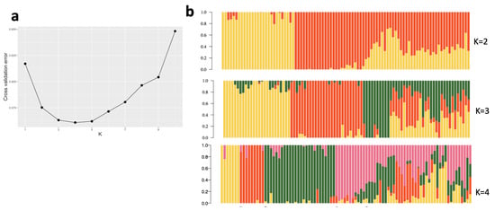 Population structure within the 92 cassava genotypes assessed with 6602 DArTseq markers. (a) Cross-validation plot. Cross-validation error is shown on the Y–axis (vertical) and the number of hypothetical populations on the X–axis (horizontal). Cross-validation revealed K = 4 as the optimal number of clusters. (b) Individual ancestry inferred with admixture. Each genotype is represented by a vertical line partitioned by color. The proportion of the color making up each vertical line represents the proportion contributed by the ancestral population. The best-supported clustering (K = 4) divided the 92 cassava genotypes into four main groups.