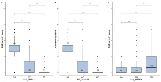 Boxplot showing allelic substitution effect for cassava mosaic disease severity. Three markers, namely S12-7926132 (a), S12-7926163 (b), and S14-4626854 (c), were evaluated. The genotypes/alleles of each marker are presented on the X–axis, while the phenotype trait and its value are mentioned on the Y–axis. The Kruskal–Wallis test was used to assess the statistical differences between genotype classes. The stars in the figure indicate levels of statistical significance. *, ***, **** significant at p ≤ 0.05, p ≤ 0.001, p ≤ 0.0001, respectively; ns = non-significant (p > 0.05).