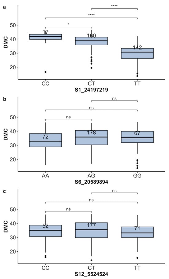 Boxplot showing allelic substitution effect for root dry matter content. Three markers, namely S1-24197219 (a), S6-20589894 (b), and S12-5524524 (c), were evaluated. The genotypes/alleles of each marker are presented on the X–axis, while the phenotype trait and its value are mentioned on the Y–axis. The Kruskal–Wallis test was used to assess the statistical differences between genotype classes. The stars in the figure indicate levels of statistical significance. *, **** significant at p ≤ 0.05 and p ≤ 0.0001, respectively; ns = non-significant (p > 0.05).