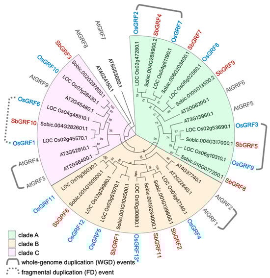 Phylogenetic analysis of the SbGRF family. OsGRFs, AtGRFs and SbGRFs were used in the phylogenetic analysis, and the GRF nomenclature was in accordance with the previous study []. Three phylogenetic clades of GRFs (i.e., clades A, B and C) were identified and are indicated in green, light yellow and pink colors, respectively. OsGRFs and AtGRFs that expanded due to the ancient whole-genome duplication events in monocots and dicots, respectively, are labeled with gray brackets. The OsGRFs that likely expanded from fragmental duplication are labeled with the gray dotted bracket.