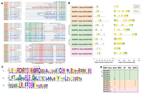 Conservation of the GRF domains. (A) The N-terminal regions of SbGRFs were aligned with the AtGRF1, OsGRF1 and OsGRF7, with AtGRF1 and OsGRF1/7 highlighted in red and blue fonts, respectively. The QLQ and WRC domains are indicated with green and red boxes with the highly conserved amino acid residues of these two domains highlighted in green and red backgrounds, respectively. The key amino acid residues for the CH zinc finger region are indicated in the gray background. (B) Analysis of the MEME-predicted protein motifs for SbGRF proteins and the gene structure analysis of SbGRF genes. (C) A detailed plot showing the MEME-predicted motifs 1, 2 and 3, while motifs 1 and 2 correspond to the WRC and QLQ domains, respectively. Black boxes indicate the conserved amino acid residues for the WRC and QLQ domains, respectively. (D) The table summarizing differences in domain and motif architectures between SbGRF proteins. “D” means a possible deletion causing a partial QLQ domain. The phylogenetic clade information of SbGRFs is indicated in background colors (green, light yellow and pink standing for clades A, B and C).