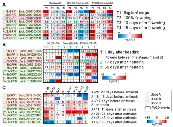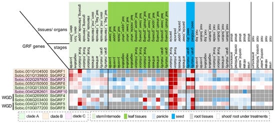 Generally, the spatio–temporal expression preference of genes is well correlated to the function of genes []. Therefore, we investigated the expression profiles of SbGRFs across multiple tissues/organs and stages by using publicly available RNA-seq datasets []. SbGRFs exhibited different expression patterns between the phylogenetic clades. For example, clade A SbGRFs showed stronger tissue/organ expression preferences than those of the other clades, mainly expressed in the shoot, stem, panicle and seeds (Figure 3). SbGRF1, 3, 6 and 9 have relatively wide expression patterns at multiple tissues and organs (e.g., stems, leaves, panicles, seeds, roots and shoots). Particularly, SbGRF10 has the highest spatio–temporal expression specificity, only detected in the growing upper internodes and growing panicles and peduncles during flower initiation. Such a specific expression pattern in the growing stem and panicle suggests SbGRF10 may have a specific role in the growing tissue, deserving future functional characterization.