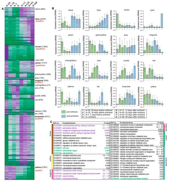 Co-expression analysis of the time-series sorghum RNA-seq data identified the SbGRFs associated with internode elongation and cell wall modification at the post-anthesis stages. (A) The heat map showing the 15 co-expression modules identified with WGCNA. The gray module represents the group of genes that do not share significant co-expression patterns. The module names are labeled, with the total number of genes per module labeled in brackets and the selected SbGRFs within the modules indicated in red. (B) Representative expression patterns (eigengenes) of the 15 co-expressed modules and the gray-module genes. The pre-anthesis and anthesis stages are presented with green bars, while the post-anthesis stages are presented with blue bars. The error bars indicate the standard deviation of eigengene expression. The eight stages of the Della internode were abbreviated as A−29, A−16, A−7, A, A+11, A+25, A+43 and A+68, respectively. A−29, 29 days before anthesis; A−16, 16 days before anthesis; A−7, 7 days before anthesis. A, anthesis; A+11, 11 days after anthesis; A+25, 25 days after anthesis; A+43, 43 days after anthesis; A+68, 68 days after anthesis. (C) The GO functional terms enriched in the SbGRF-containing co-expression modules (i.e., the brown, green, magenta, turquoise and yellow modules), with the GO term numbers and term descriptions and P values provided. The molecular function GO terms, biological process terms and cellular component terms are indicated in purple, black and green fonts, respectively.