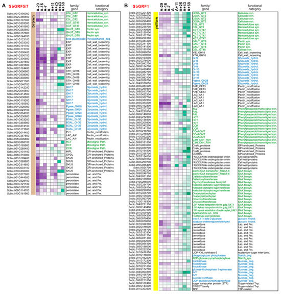 The expression patterns of select carbohydrate metabolic genes in the brown (A) and yellow (B) modules of the Della co-expression network. The representative carbohydrate metabolic genes were selected to show their expression profiles based on the gene annotations reported [,,]. Expression patterns of the carbohydrate metabolic genes in the SbGRF-containing modules with declining trends (i.e., the brown and yellow modules) are shown in the figure. Gene expression dynamics are shown in heatmaps and the colors are shaded to reflect the magnitude of log2 fold change of gene expression relative to the anthesis stage in each co-expression network. The sorghum geneIDs are given on the left side of the heat map, while the gene annotation and their functional categories are provided on the right side of the heat map, with the biosynthetic and degradation genes shown in green and blue fonts, respectively.