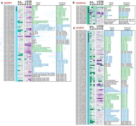 The expression patterns of select carbohydrate metabolic genes in the blue (A), green (B) and turquoise (C) modules of the Della co-expression network. The representative carbohydrate metabolic genes were selected to show their expression profiles based on the gene annotations reported [,,]. Expression patterns of the carbohydrate metabolic genes in the SbGRF-containing modules with increasing trends (i.e., the blue, green and turquoise modules) are shown in the figure. Gene expression dynamics are shown in heatmaps and the colors are shaded to reflect the magnitude of the log2 fold change of gene expression relative to the anthesis stage in each co-expression network. The sorghum geneIDs are given on the left side of the heat map, while the gene annotation and their functional categories are provided on the right side of the heat map, with the biosynthetic and degradation genes shown in green and blue fonts, respectively.