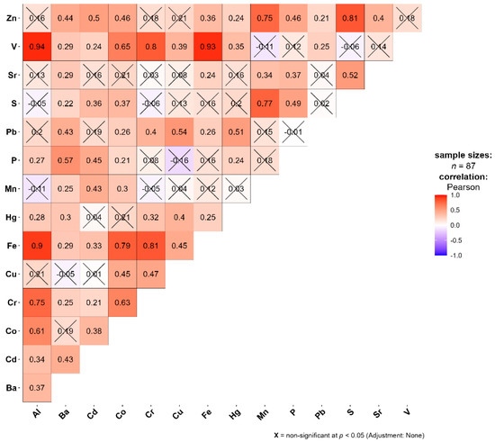 Strong positive correlations (r ≥ 0.7) were evident between Al and V, Al and Fe, and Al and Cr. There were also strong and significant correlations between Co and Fe, Cr and Fe, Cr and V, Fe and V, and Fe and Cr. Additionally, Mn showed a high correlation with S and Zn (Figure 2). No correlations were evident between Ba, Cd, Hg, P, and Sr and any other metals.