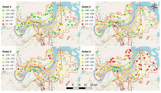 Factor 4 (which accounts for 13% of the explained variance) is represented by Ba and P. Barium is a component of the filler of brake linings [28]. Mineral dust and coal combustion are the dominant sources of atmospheric P emissions [44]. Since high concentrations of these elements were found near highways, road and mineral dust can be considered the main sources of their emissions in Perm.