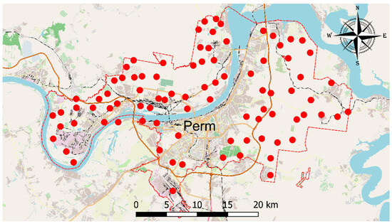 Passive moss biomonitoring was performed in Perm, a city with an area of about 800 km2 located in the Cis-Ural region, which is one of the largest industrial centers of the Russian Federation and the Perm region. Perm is located on the border of two forest regions: the taiga zone, which is the southern taiga region of the European part of the Russian Federation, and the coniferous broadleaved forest zone, which is the region of coniferous–deciduous (mixed) forests of the European part of the Russian Federation (southern part). Urban forests make up slightly more than 330 km2 (more than 40% of the city’s territory). The climate in Perm is moderately continental, with an average temperature of +17 °C in July and −15 °C in January. Annual precipitation is 500–600 mm. Loamy and soddy-podzolic soils prevail.