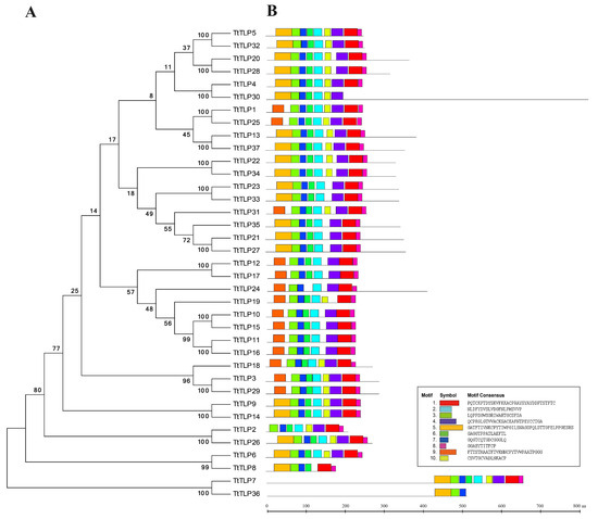 (A) Phylogenetic relationships of the 37 TtTLPs from T. tetragonoides. (B) The conserved motifs of each group of TtTLPs identified using the MEME web server. Different motifs are represented by different colored boxes, and the motif sequences are provided at the bottom.