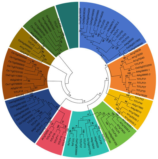 Phylogenetic relationships of the 37 TtTLPs from T. tetragonoides, 27 AtTLPs from Arabidopsis thaliana, and 30 OsTLPs from Oryza sativa. The amino acid sequences of these 94 TLPs from three plant species were compared with ClustalW alignment, and the phylogenetic tree was constructed in MEGA X using the neighbor-joining method, with 1000 bootstrap repetitions. The different branch colors represent different subgroups.