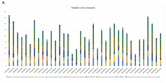 The CEs in the gene promoter region are necessary for the regulation of gene expression during plant development and under different environmental conditions, mainly by binding to specific TFs. The promoter sequences in the 2 kb region upstream of all TtTLPs’ 5′-untranslated regions (5′-UTRs) were analyzed. Based on their putative functions, the 13 identified CEs were segregated into two groups: hormone-specific and abiotic stress-responsive elements. Here, we mainly summarized their numbers (Figure 5A) and localized the specific CE positions (Figure 5B) in the promoter regions. This information explained the biological functions of TtTLPs by predicting their possible expression regulatory mechanisms.