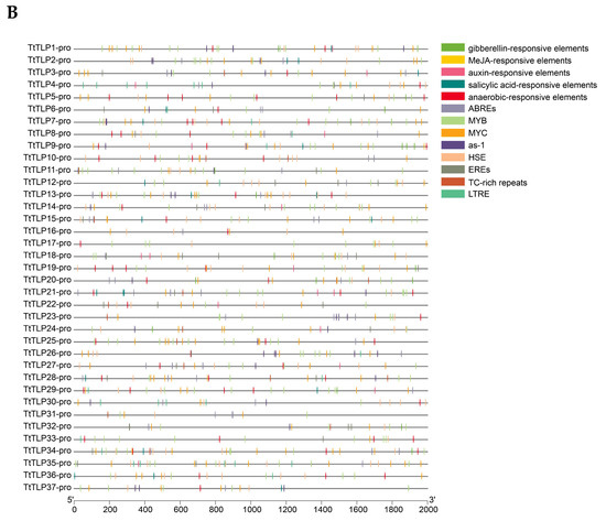 Statistics for predicted cis-acting elements in the TtTLP promoters (ATG_upstream 2000 bp). (A) Summaries of the 13 cis-acting elements in the promoter regions of 37 TtTLPs. The scale bar represents 200 bp. (B) Distribution of the 13 cis-acting elements in the 37 TtTLP promoter regions. The elements are represented by different symbols. Information on these elements is listed in Table S3.