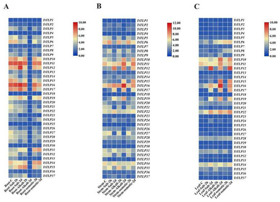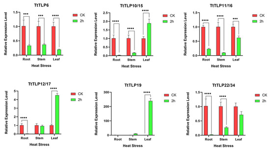 In addition to in silico analysis, the expression profiles of stress-responsive TtTLPs were validated by quantitative reverse transcription PCR (qRT-PCR) (Figure 8 and Figure 9). First, the transcripts of six TtTLPs were tested under a heat challenge. Overall, TtTLP19 expression was strongly induced by heat stress. In leaf samples, the expression of TtTLP10 and TtTLP12 was also induced, while the expression of TtTLP6, TtTLP11, and TtTLP22 was decreased slightly by heat stress (Figure 8).