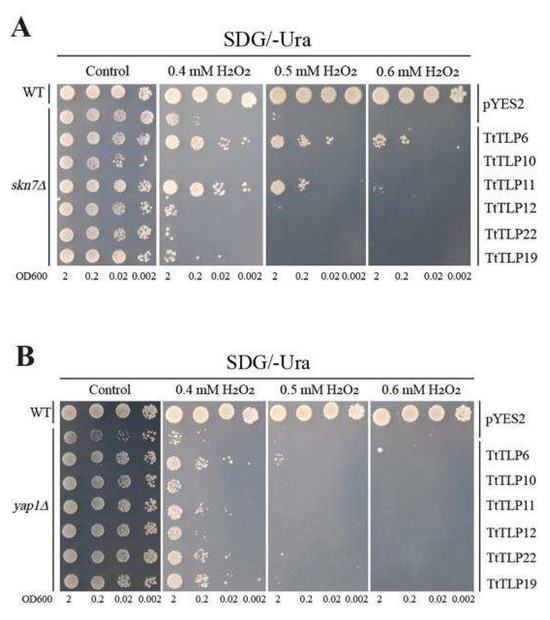 Functional identification related to hydrogen peroxide (H2O2) tolerance of six TtTLPs in yeast using heterologous expression assays. The yeast wild-type (WT) and two H2O2-sensitive mutant strains, skn7∆ and yap1∆, were transformed with the empty vector pYES2 or six recombinant vectors, namely TtTLP6-pYES2, TtTLP10-pYES2, TtTLP11-pYES2, TtTLP12-pYES2, TtTLP22-pYES2, and TtTLP19-pYES2. (A) H2O2 (0, 0.4, 0.5, and 0.6 mM) tolerance in skn7∆; (B) H2O2 (0, 0.4, 0.5, and 0.6 mM) tolerance in yap1∆. The yeast strains were cultured and spotted, as described above.