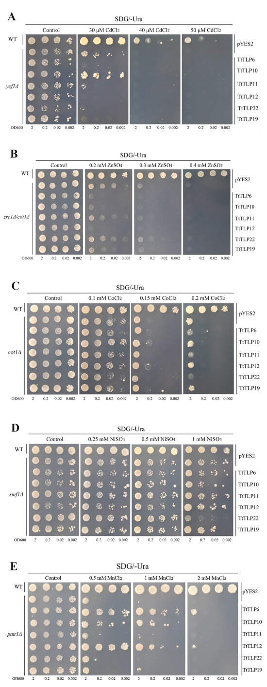 Functional identification related to heavy metal (HM) tolerance of six TtTLPs in yeast using heterologous expression assays. The yeast wild-type (WT) and a series of metal-sensitive mutant strains were transformed with the empty vector pYES2 or six recombinant vectors, namely TtTLP6-pYES2, TtTLP10-pYES2, TtTLP11-pYES2, TtTLP12-pYES2, TtTLP22-pYES2, and TtTLP19-pYES2. (A) Cadmium (Cd, 0, 30, 40, and 50 μM) tolerance in ycf1∆; (B) zinc (Zn, 0, 0.2, 0.3, and 0.4 mM) tolerance in zrc1∆cot1∆; (C) cobalt (Co, 0, 0.1, 0.15, and 0.2 mM) tolerance in cot1∆; (D) nickel (Ni, 0, 0.25, 0.5, and 1 mM) tolerance in smf1∆; and (E) manganese (Mn, 0, 0.5, 1, and 2 mM) tolerance in smf1∆. The yeast strains were cultured and spotted, as described previously.