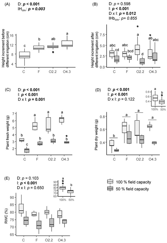 Effects of Oxalis pes-caprae waste dose (D), water irrigation (I) and the interaction between these two factors (D × I) on height increments before and after different irrigation (A,B), plant fresh and dry weight (C,D), and relative water content (RWC) (E) of the horticultural species Diplotaxis tenuifolia. Boxplots show the median values inside the boxes that bound the 25th and 75th percentile values. The dots represent values outside of the 10th and 90th percentile (represented by whiskers). IHcov: initial height covariable, IHbcov: initial height before different irrigation levels covariable, C: control, F: commercial fertilizer, O2.2: Oxalis waste at a dose of 2.2 kg m−2, O4.3: Oxalis waste at a dose of 4.3 kg m−2. Different letters indicate statistically significant differences at p ≤ 0.05 (in bold) level using general/generalized linear models followed by Sidak’s post hoc test, n = 7. When the interaction factor (D × I) is significant, statistical letters refer first to differences among C100%, C50%, F100%, F50%, O100%, and O50% treatments. Otherwise, statistical letters refer to differences between C, F, and O treatments when factor D is significant and/or to differences between 100% and 50% treatments (small figure inside the figure) when factor I is significant.