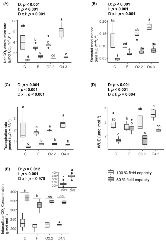 Effects of Oxalis pes-caprae waste dose (D), water irrigation (I), and the interaction between these two factors (D × I) on net CO2 assimilation rate (A), stomatal conductance (B), transpiration rate (C), water use efficiency (WUE) (D), and intercellular CO2 concentration (E) of the horticultural species Diplotaxis tenuifolia. Boxplots show the median values inside the boxes that bound the 25th and 75th percentile values. The dots represent values outside of the 10th and 90th percentile (represented by whiskers). C: control, F: commercial fertilizer, O2.2: Oxalis waste at a dose of 2.2 kg m−2, O4.3: Oxalis waste at a dose of 4.3 kg m−2. Different letters indicate statistically significant differences at p ≤ 0.05 (in bold) level using general/generalized linear models followed by Sidak’s post hoc test, n = 7. When the interaction factor (D × I) is significant, statistical letters refer first to differences among the C100%, C50%, F100%, F50%, O100%, and O50% treatments. Otherwise, statistical letters refer to differences between the C, F, and O treatments when factor D is significant and/or to differences between the 100% and 50% treatments (small figure inside the figure) when factor I is significant.