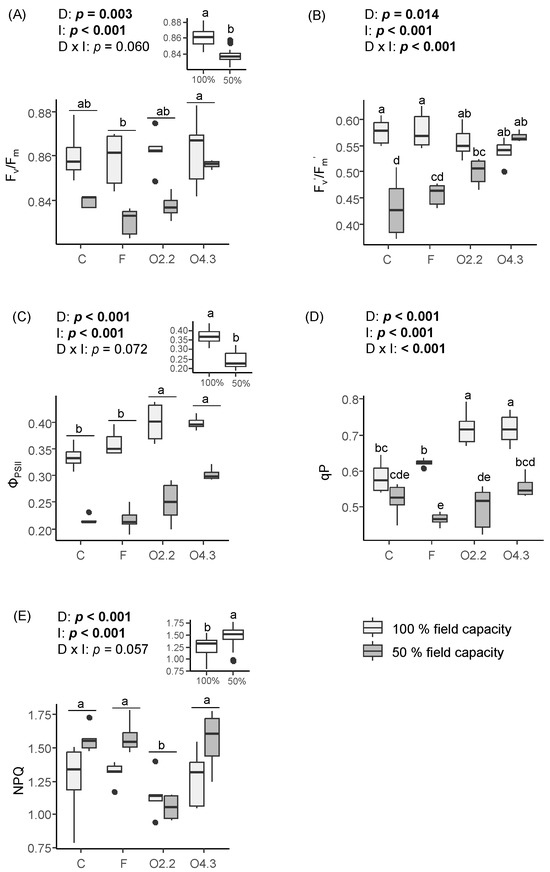 Effects of Oxalis pes-caprae waste dose (D), water irrigation (I), and the interaction between these two factors (D × I) on the maximum quantum efficiency of photosystem II (Fv/Fm) (A), efficiency of excitation energy capture by open PSII reaction centers (Fv’/Fm’) (B), effective efficiency of photosystem II (ΦPSII) (C), photochemical quenching (qP) (D), and non-photochemical quenching (NPQ) (E) of the horticultural species Diplotaxis tenuifolia. Boxplots show the median values inside the boxes that bound the 25th and 75th percentile values. The dots represent values outside of the 10th and 90th percentile (represented by whiskers). C: control, F: commercial fertilizer, O2.2: Oxalis waste at a dose of 2.2 kg m−2, O4.3: Oxalis waste at a dose of 4.3 kg m−2. Different letters indicate statistically significant differences at p ≤ 0.05 (in bold) level using general/generalized linear models followed by Sidak’s post hoc test, n = 7. When the interaction factor (D × I) is significant, statistical letters refer first to differences among the C100%, C50%, F100%, F50%, O100%, and O50% treatments. Otherwise, statistical letters refer to differences between the C, F, and O treatments when factor D is significant and/or to differences between the 100% and 50% treatments (small figure inside the figure) when factor I is significant.