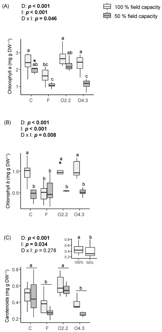 Effects of Oxalis pes-caprae waste dose (D), water irrigation (I), and the interaction between these two factors (D × I) on the contents of chlorophylls a and b (A,B) and carotenoids (C) in the horticultural species Diplotaxis tenuifolia. Boxplots show the median values inside the boxes that bound the 25th and 75th percentile values. The dots represent values outside of the 10th and 90th percentile (represented by whiskers). C: control, F: commercial fertilizer, O2.2: Oxalis waste at a dose of 2.2 kg m−2, O4.3: Oxalis waste at a dose of 4.3 kg m−2, DW: dry weight. Different letters indicate statistically significant differences at p ≤ 0.05 (in bold) level using general/generalized linear models followed by Sidak’s post hoc test, n = 7. When the interaction factor (D × I) is significant, statistical letters refer first to differences among the C100%, C50%, F100%, F50%, O100%, and O50% treatments. Otherwise, statistical letters refer to differences between the C, F, and O treatments when factor D is significant and/or to differences between the 100% and 50% treatments (small figure inside the figure) when factor I is significant.