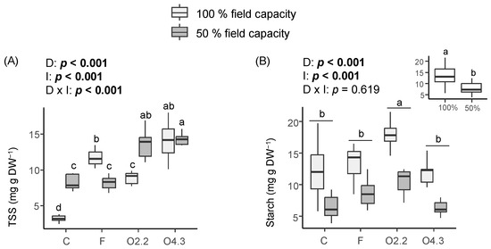 Effects of Oxalis pes-caprae waste dose (D), water irrigation (I), and the interaction between these two factors (D × I) on the contents of total soluble sugars (TSS) (A) and starch (B) in the horticultural species Diplotaxis tenuifolia. Boxplots show the median values inside the boxes that bound the 25th and 75th percentile values. C: control, F: commercial fertilizer, O2.2: Oxalis waste at a dose of 2.2 kg m−2, O4.3: Oxalis waste at a dose of 4.3 kg m−2, DW: dry weight. Different letters indicate statistically significant differences at p ≤ 0.05 (in bold) level using general/generalized linear models followed by Sidak’s post hoc test, n = 7. When the interaction factor (D × I) is significant, statistical letters refer first to differences among the C100%, C50%, F100%, F50%, O100%, and O50% treatments. Otherwise, statistical letters refer to differences between the C, F, and O treatments when factor D is significant and/or to differences between the 100% and 50% treatments (small figure inside the figure) when factor I is significant.