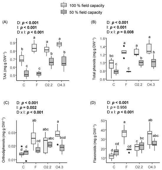 Effects of Oxalis pes-caprae waste dose (D), water irrigation (I), and the interaction between these two factors (D × I) on the total antioxidant activity (TAA) (A), total phenols (B), orthodiphenols (C), and flavonoids (D) in the horticultural species Diplotaxis tenuifolia. Boxplots show the median values inside the boxes that bound the 25th and 75th percentile values. The dots represent values outside of the 10th and 90th percentile (represented by whiskers). C: control, F: commercial fertilizer, O2.2: Oxalis waste at a dose of 2.2 kg m−2, O4.3: Oxalis waste at a dose of 4.3 kg m−2, DW: dry weight. Different letters indicate statistically significant differences at p ≤ 0.05 (in bold) level using general/generalized linear models followed by Sidak’s post hoc test, n = 7. When the interaction factor (D × I) is significant, statistical letters refer first to differences among the C100%, C50%, F100%, F50%, O100%, and O50% treatments.
