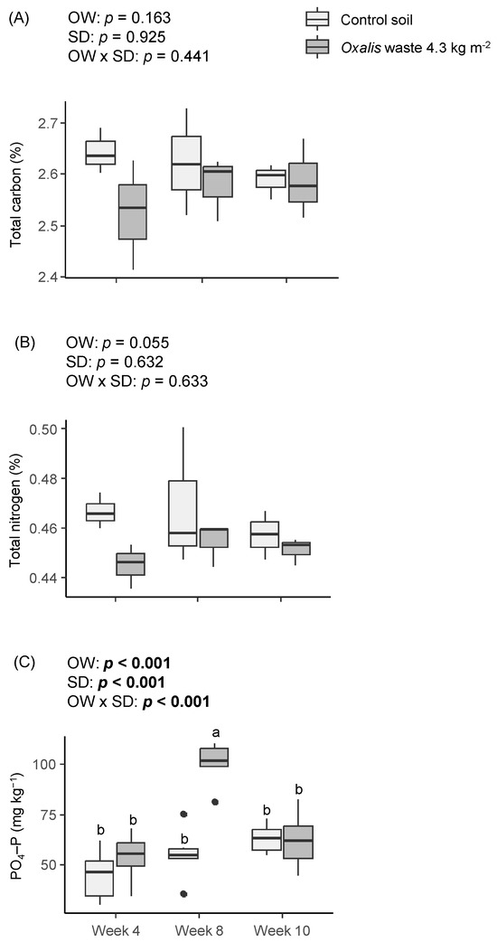 Effects of Oxalis pes-caprae waste (OW), the sampling date (SD), and the interaction between these two factors (OW × SD) on the total carbon (A), total nitrogen (B), and extractable phosphorous (C) in the soils during the Oxalis waste decomposition. Boxplots show the median values inside the boxes that bound the 25th and 75th percentile values. The dots represent values outside of the 10th and 90th percentile (represented by whiskers). Different letters indicate statistically significant differences at p ≤ 0.05 level (in bold) using repeated measured models followed by Sidak’s post hoc test, n = 6. When the interaction factor (OW × SD) is significant, statistical letters refer first to differences between the Week 4 control, Week 4 Oxalis waste, Week 8 control, Week 8 Oxalis waste, Week 10 control, and Week 10 Oxalis waste treatments. The absence of letters on a figure indicates that there are no significant statistical differences for any analysis factor.