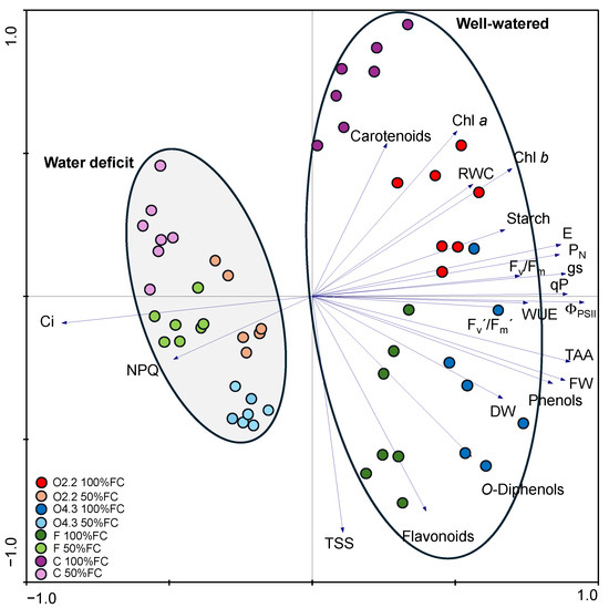 Principal component analysis (PCA) (x—first component and y—second component) of the physiological parameters in the wild rocket under well-watered and water deficit conditions. The first axis (PC1) explains 52% of the total variance and the second axis (PC2) explains 14% of the total variance. Colored circles represent sample scores and arrows show gradients resulting from water status, weight, pigments, carbohydrates, photosynthesis, oxidative stress, and antioxidant profiles. C: control, F: commercial fertilizer, O2.2: Oxalis waste at a dose of 2.2 kg m−2, O4.3: Oxalis waste at a dose of 4.3 kg m−2, FC: field capacity, Chl a: chlorophyll a, Chl b: chlorophyll b, Ci: intercellular CO2 concentration, DW: dry weight, E: transpiration rate, Fv/Fm: maximum quantum efficiency of photosystem II, Fv’/Fm’: efficiency of excitation energy capture by open PSII reaction centers, gs: stomatal conductance, FW: fresh weight, NPQ: non-photochemical quenching, PN: net CO2 assimilation rate, qP: photochemical quenching, RWC: relative water content, TAA: total antioxidant activity, TSS: total soluble sugars, WUE: water use efficiency, ΦPSII: effective efficiency of photosystem II.