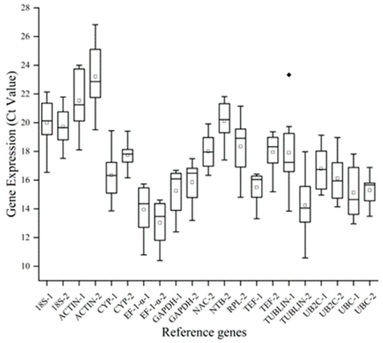 Ct values of the 21 candidate reference genes. The line across the box represents the median. The boxes represent the 25/75 percentiles. The lower and upper dashes depict the minimum and maximum value. White circles represent the mean values, while black diamond indicate outliers.